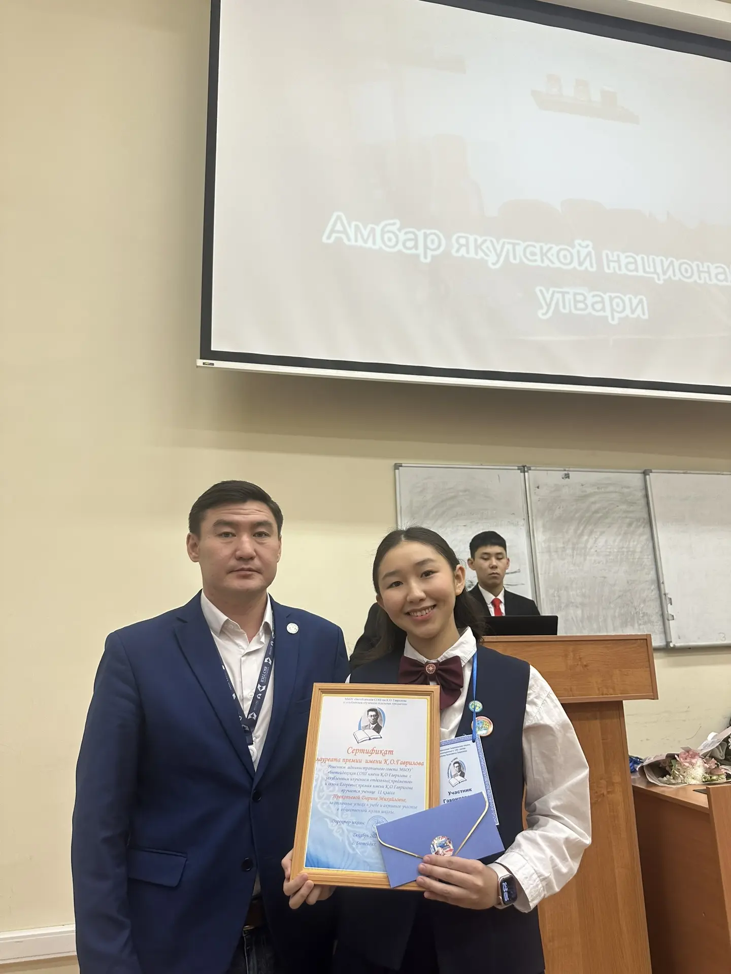 Сертификат Лауреата премии имени К.О. Гаврилова за отличную учебу и активную жизненную позицию вручили Прокопьевой Дарине, ученице 11 класса и за высокие показатели в обучении и воспитании подрастающего поколения и активную общественную деятельность Ивановой Надежде Владмировне, учителю начальных классов.